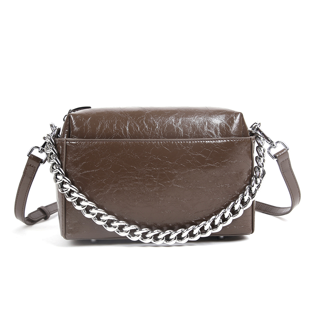 Оригинальная кросс-боди MIRONPAN в коричневом цвете выполнена из натуральной гладкой кожи с блестящей лаковой поверхностью .Сумка закрывается на молнию с металлическим поводком. Внутри 2 боковых кармана для мелочей: открытый и на молнии. На лицевой и тыльной стороне расположены одинаковые по дизайну, вместительный карманы на магнитной кнопки. Дно сумки защищают 4 металлические ножки. В качестве декора выступает съемная цепочка со средними звеньями, которая также может быть использована в качестве короткого ремня. Съемный плечевой ремень регулируется по длине, ширина - 1,5 см.
