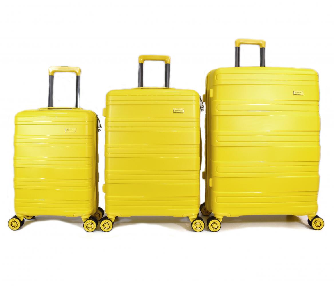 Комплект чемоданов MIRONPAN - модель в желтом цвете выполнена из полипропилена – современного материала, для которого характерны высокая ударопрочность, стойкость к перепадам температур, отличная износостойкость. Внутри два отделения: одно - с ремнями-фиксаторами и с прозрачной перегородкой-сеткой на молнии; другое - с тканевой перегородкой на молнии и двумя карманами-сетками на молнии. Выдвижная ручка фиксируется в 3-х положениях. Сверху и сбоку есть ручки для удобства переноски. 4 двойных колеса вращаются на 360°, позволяя чемодану двигаться легко и плавно.